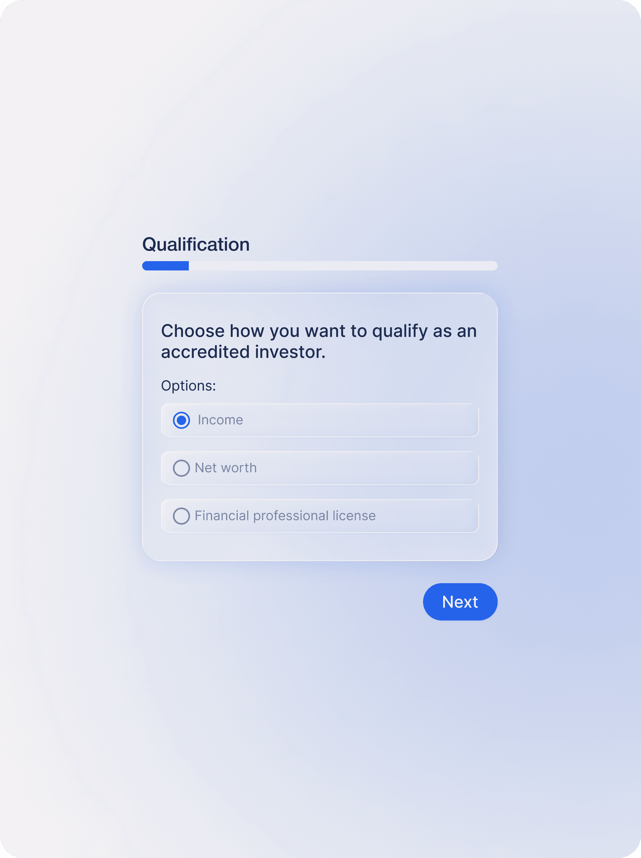 Tell us how you qualify as an accredited investor. Income, net worth, or a qualifying financial license. We route you instantly to the right verification path so there’s no guesswork.