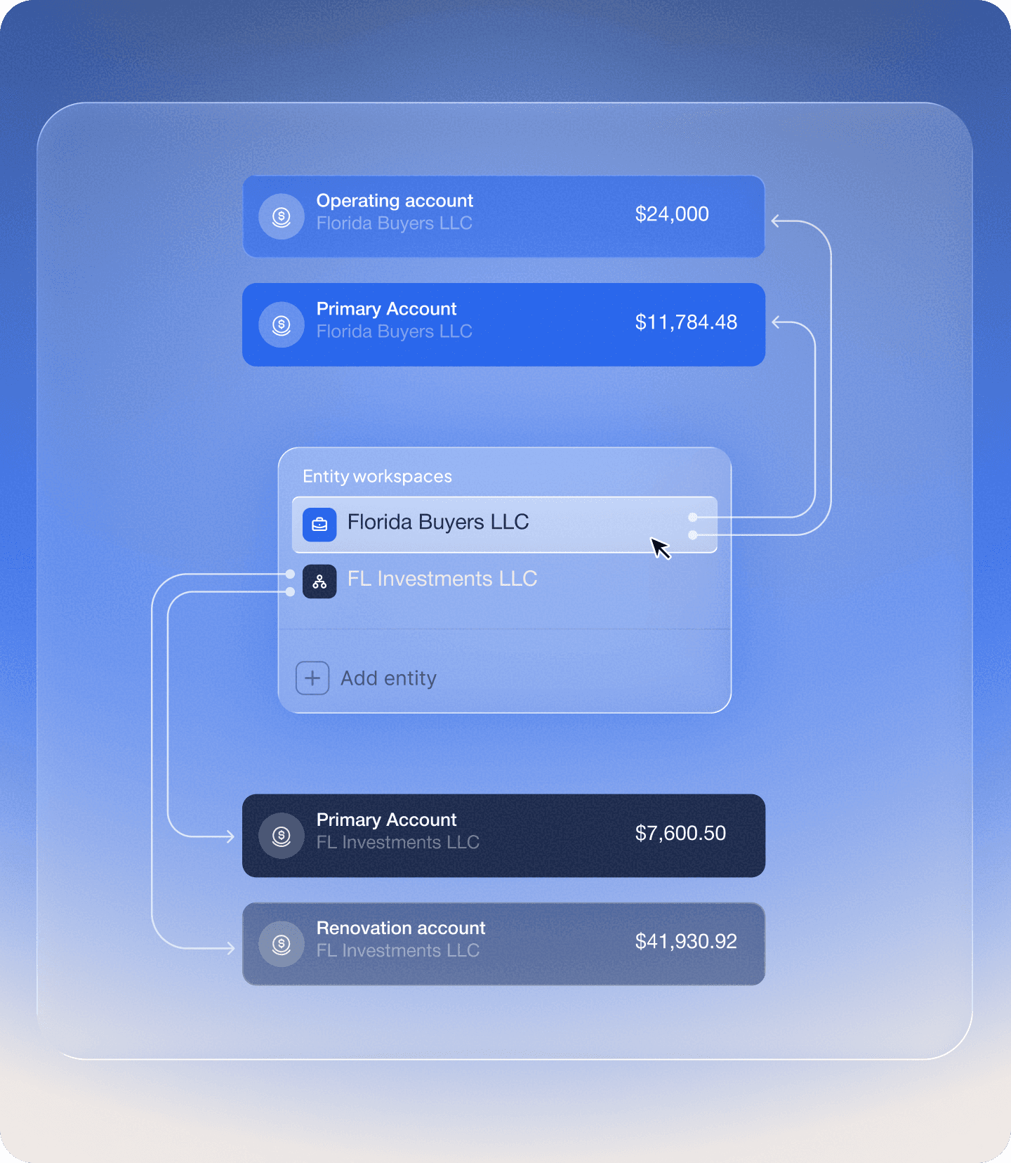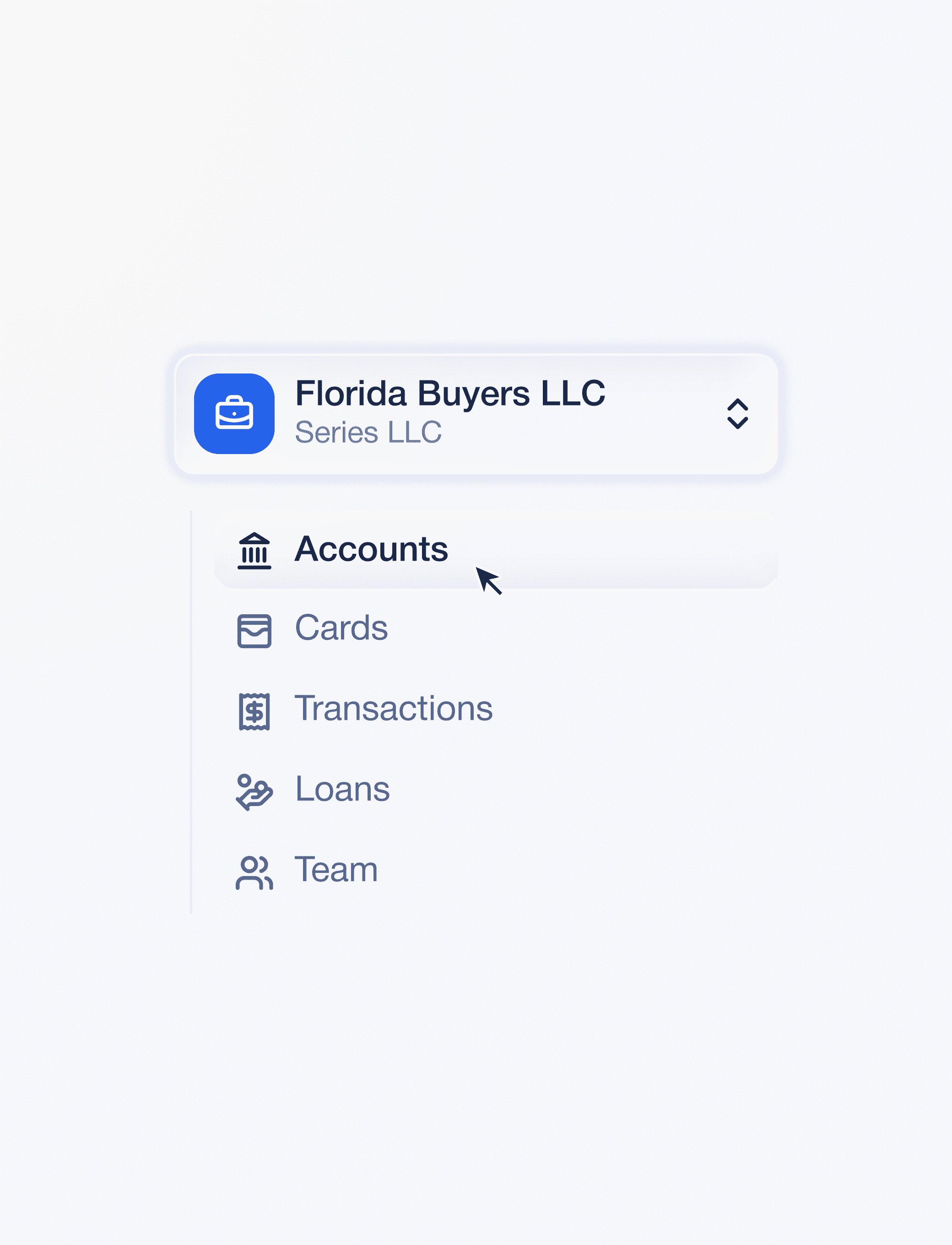 Each LLC or property operates inside its own workspace with separate accounts, cards, transactions, loans, and permissions.