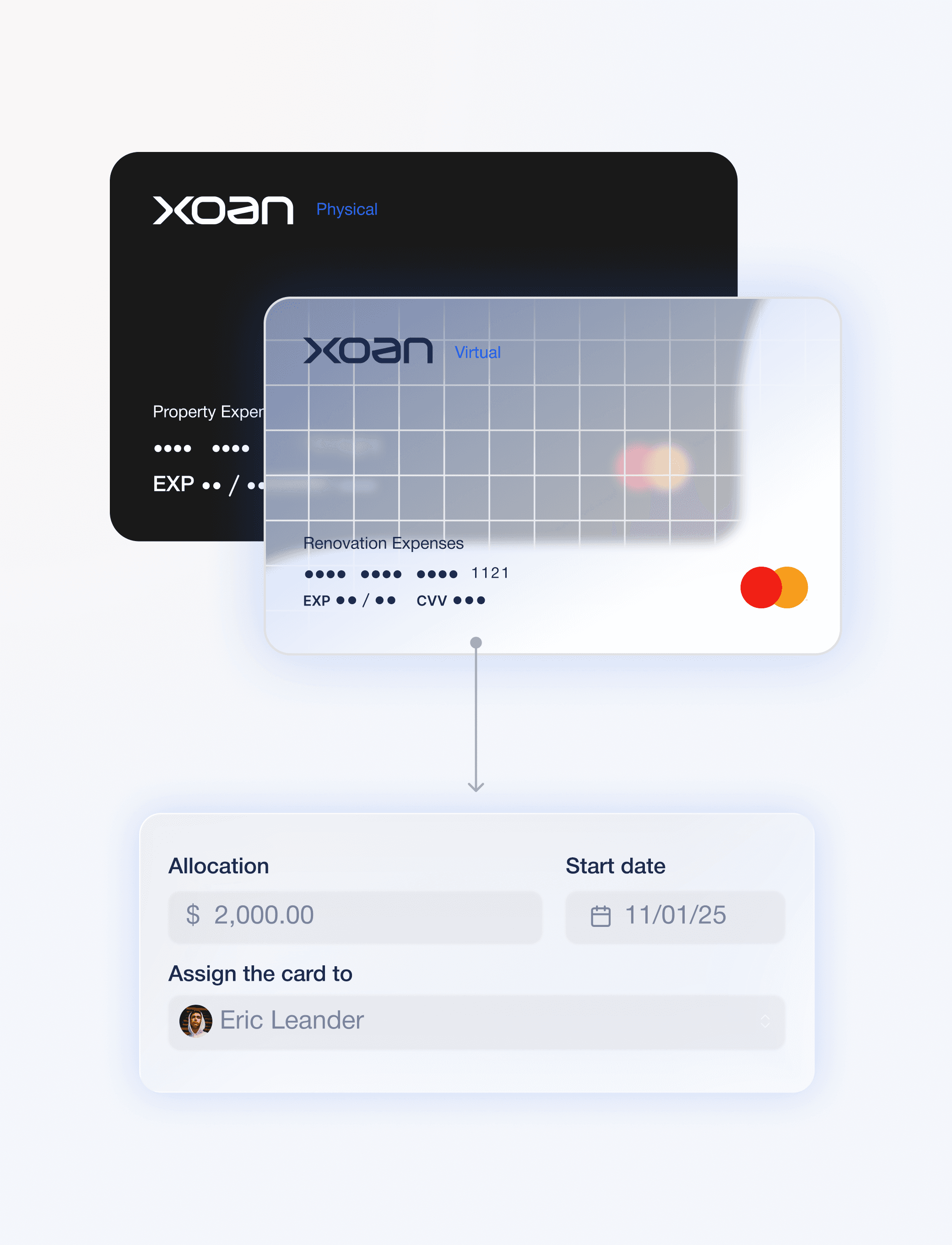 Issue physical and virtual business cards that spend directly from the correct Xoan account. Cards are always linked to the intended entity and property context, not a shared pool of funds.